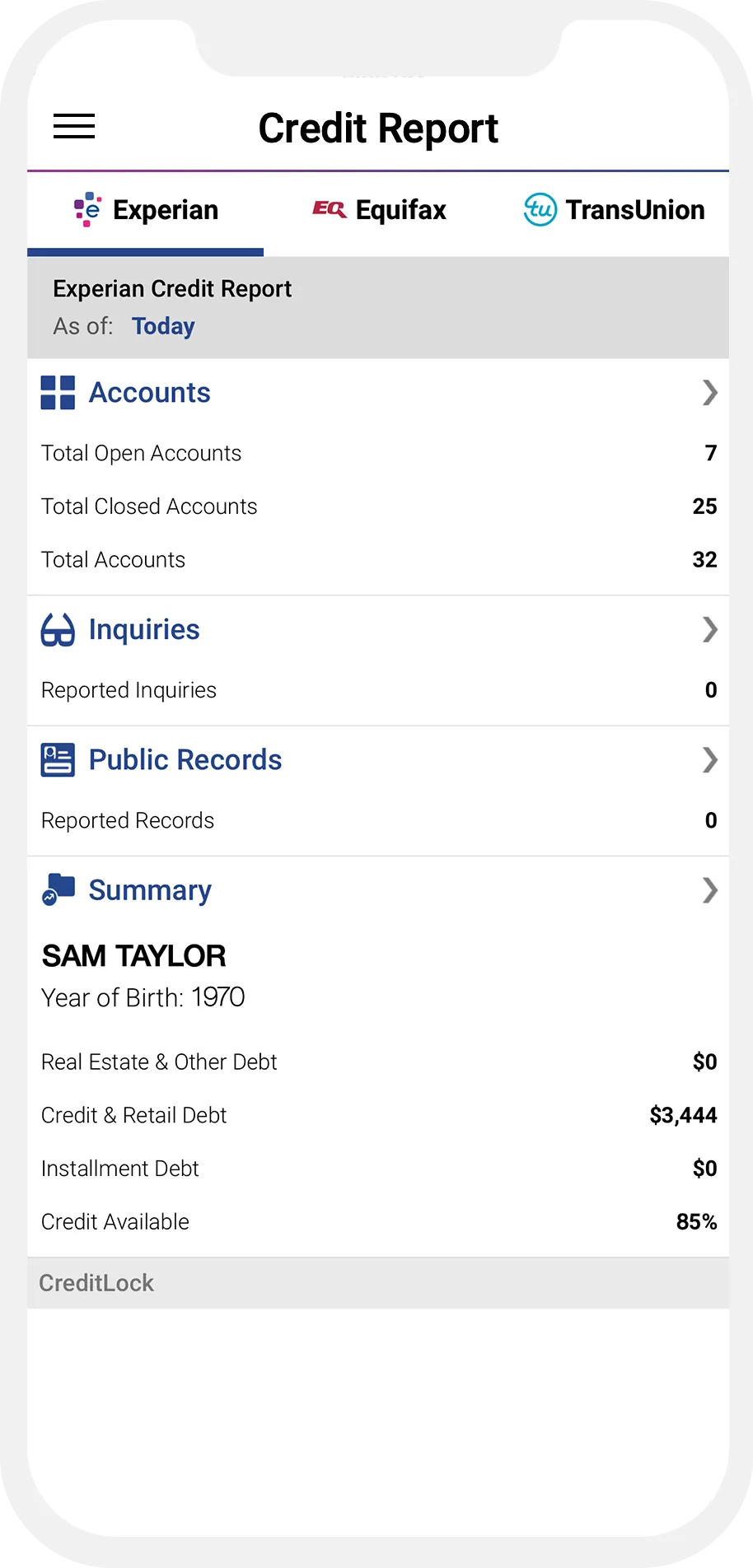 CreditLock allows you to use the mobile app to lock your Experian credit file, which can protect you from identity theft. And if you do fall victim to identity theft, Experian's Premium membership provides insurance coverage to protect your finances, along with providing other identity theft and monitoring services.