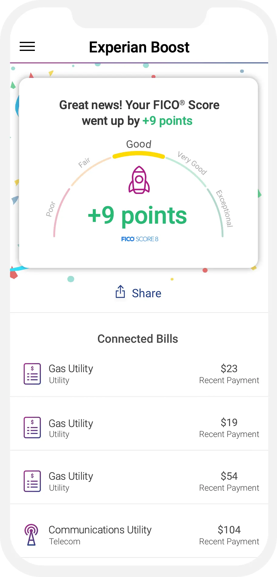 Experian Boost is a tool that allows you to add your positive payment history from utility, phone and Netflix® bills to your Experian credit file. To use Experian Boost, you'll opt in, connect the bank account you use to pay your bills and confirm eligible payments. Since these bill payments wouldn't otherwise be on your credit report, Experian Boost can help increase your credit score.